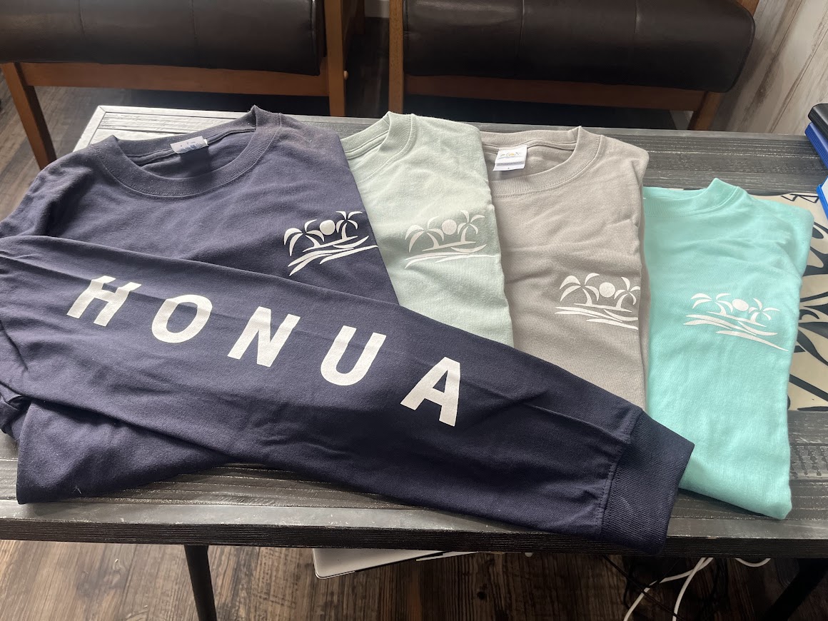 HONUA オリジナルグッズ販売 お気軽にお問い合わせください。 BASEサイトでも販売しております。 e-mail hawaii@honua.net パーカー ロングTシャツ ポーチ 小 大 本革コインケース 本革キーホルダー