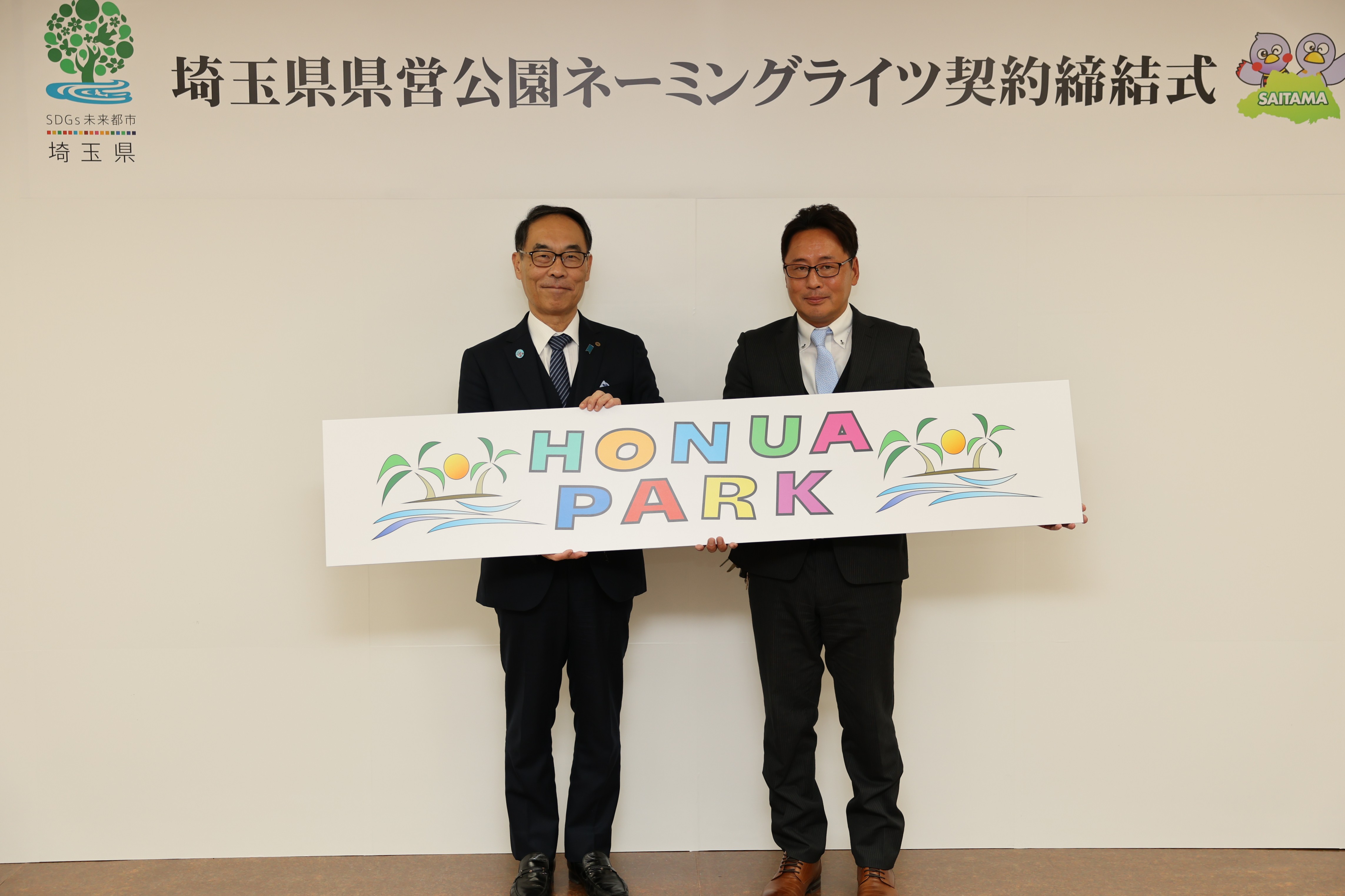 令和7年12月24日 埼玉県県営公園ネーミングライツ締結式に出席しました。和光樹林公園の施設の一部、芝生広場をHONUAPARKへとネーミングさせていただくことになりました。県民の皆様に広く親しまれている県営公園にネーミングライツという形で関わらせていただき大変光栄に、また大きな責任として受け止めております。「HONUA」-「大地・地球」という言葉のとおり、芝生広場が多くの方にとって、大地に触れ、集い、憩う場所であり続けてほしいという思いを込めた名称です。本公園がより一層、県民の皆様に愛される空間となるよう、微力ながら地域貢献に努めてまいります。